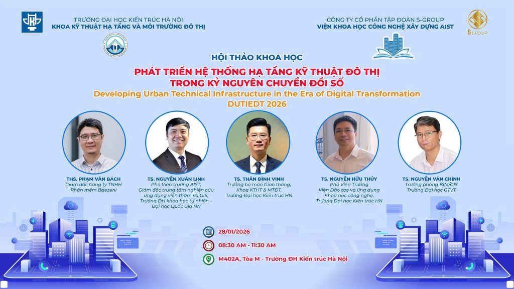 Ngày 28/01/2026 tới đây, Viện Khoa học Công nghệ Xây dựng AIST và Công ty Cổ phần Tập đoàn S-Group Việt Nam phối hợp cùng Khoa Kỹ thuật Hạ tầng và Môi trường Đô thị – Trường Đại học Kiến trúc Hà Nội tổ chức Hội thảo khoa học với chủ đề “Phát triển hệ thống hạ tầng kỹ thuật đô thị trong kỷ nguyên chuyển đổi số – DUTIEDT 2026”.